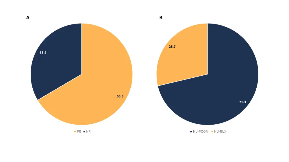 Figure 2. A) Response rates of patients who experienced a poor response to HU; B) Percentage of patients who experienced a poor response to HU who either remained on HU or switched to RUX*