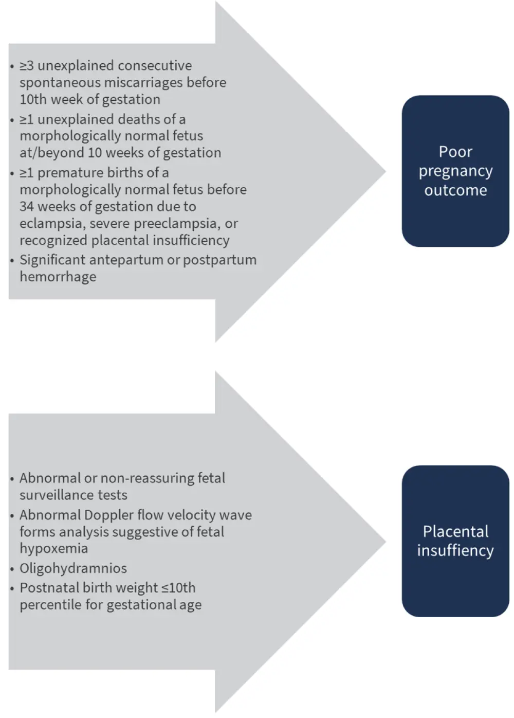 Patients diagnosed with MPN and of a reproductive age should begin with a risk assessment according to disease status, concomitant illnesses, and prior pregnancy outcomes, followed by a discussion of risks and benefits of therapeutic options in pregnancy. These include aspirin, low-molecular-weight heparin, venesection, and cytoreductive agents. Criteria for the assessment of poor pregnancy outcomes and placental insufficiency in patients with MPN in the UK are shown in Figure 1.