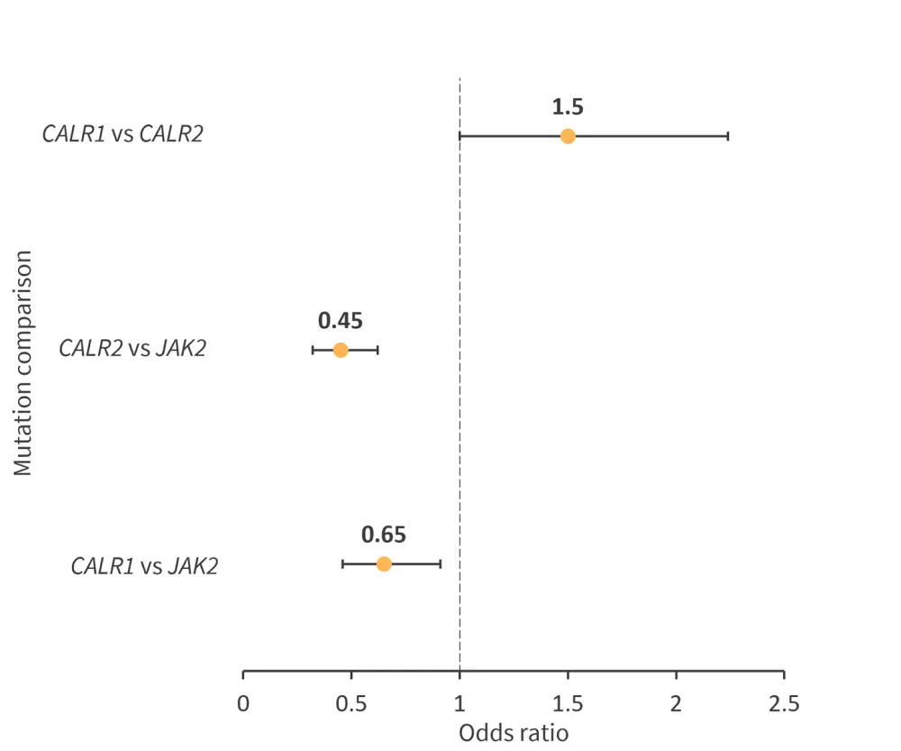Results from this meta-analysis show that patients with either a CALR1 or CALR2 mutation have a lower thrombotic risk compared with patients with a JAK2 mutation and patients with a CALR1 mutation have a higher risk of thrombosis vs patients with a CALR2 mutation. The pathophysiology underlying this difference remains unknown; however, it has been suggested that CALR2 reduces activation of the thrombopoietin receptor and adenosine diphosphate-induced platelet activation due to its lower net positive charge.
