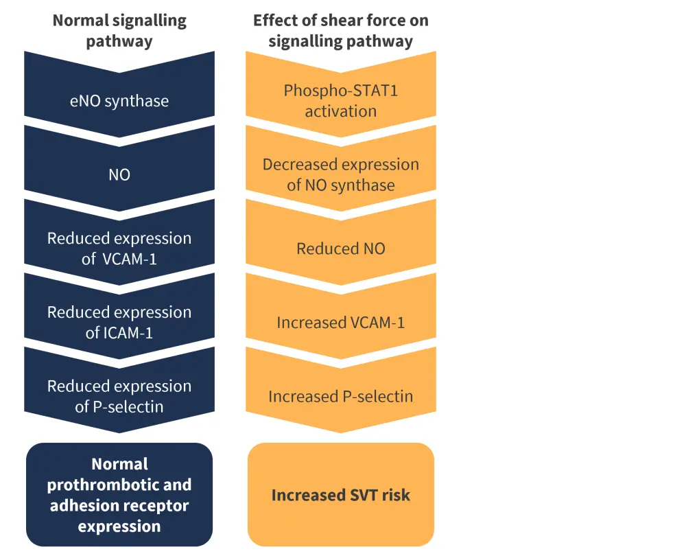 The disruption of the nitric oxide signaling pathway is thought to be another important factor in the increased risk of SVT (Figure 2).1