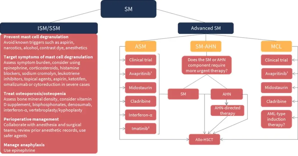 AHN, associated hematologic neoplasm; Allo-HSCT, allogeneic hematopoietic stem cell transplantation; AML, acute myeloid leukemia; ASM, aggressive SM; ISM, indolent SM; MCL, mast cell leukemia; SM, systemic mastocytosis; SM-AHN, SM with an associated hematologic neoplasm; SSM, smoldering SM.