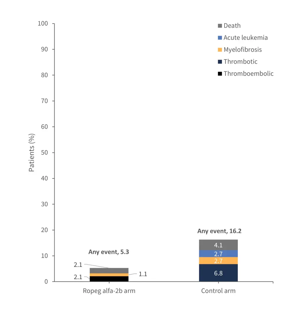 Following treatment for ≥6 years, ropeginterferon alfa-2b resulted in an improved EFS compared with HU or BAT. Furthermore, a higher molecular response, accompanied by lower burden of the JAK2V617F allele was observed with ropeginterferon alfa-2b treatment. However, it is important to note that safety data was not consistently improved compared with the control arm, with a higher number of patients discontinuing treatment and no significant differences observed Grade ≥3 treatment related adverse events.