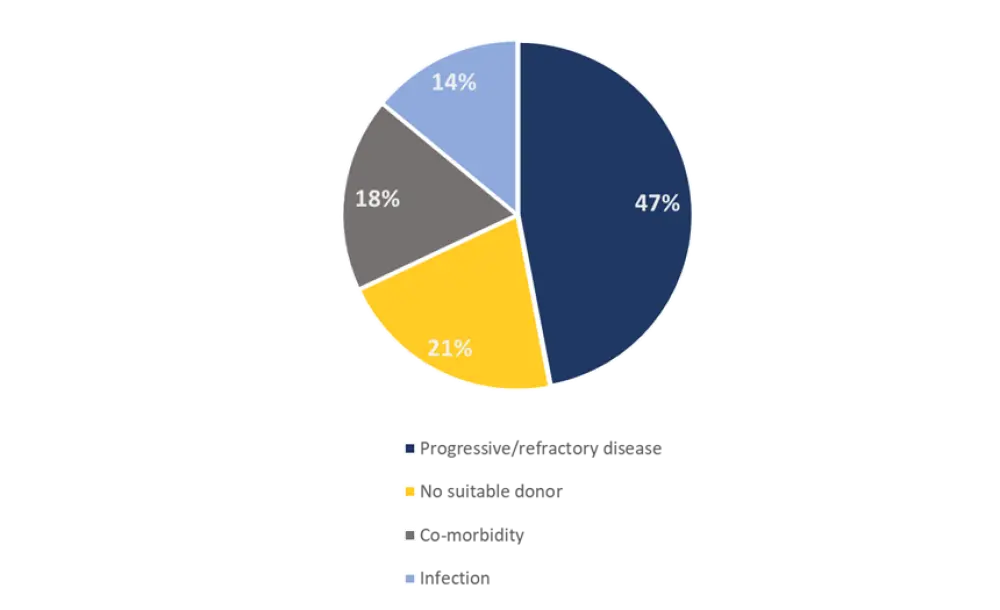 A total of 25% of patients in Group 1 failed to reach eligibility for HSCT compared with 22% of patients in Group 2. In Group 2, the time between the date the patient was identified as a potential HSCT candidate and when the patient was considered ineligible for HSCT was 153 days. The reasons for failed HSCT eligibility in Group 2 are shown in Figure 1.