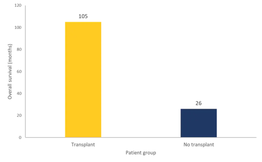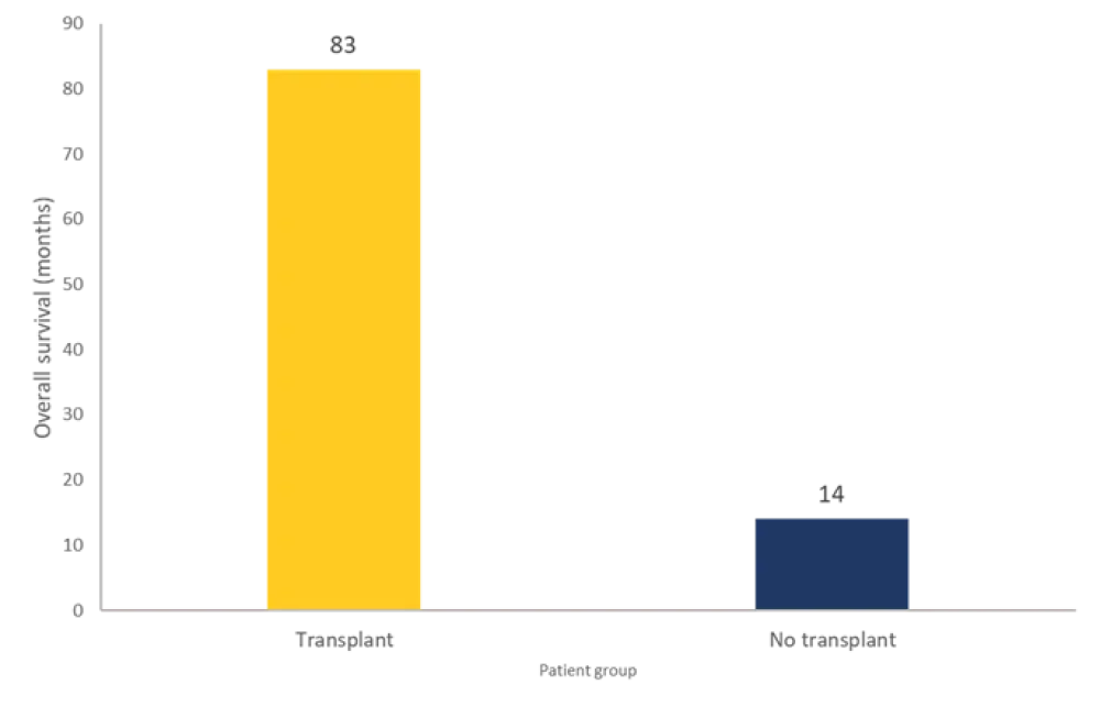 A total of 70 patients were still alive at data cutoff, with a median follow-up time of 41.5 months. The OS rate was 82 months. The OS of transplanted patients vs those who received no treatment is shown in Figure 5. From this group, 27 patients relapsed post-HSCT at a median of 10 months, and 18 died due to nonrelapse mortality at a median of 4 months. The 22 patients who failed to reach HSCT are now deceased. The median time from confirming unsuitability to death was 1.4 months. The causes of death were disease progression (64%), infection (32%), and pulmonary embolism (4%).