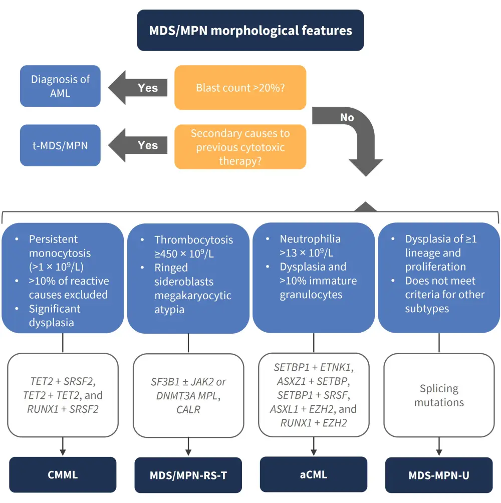 aCML, atypical chronic myeloid leukemia; AML, acute myeloid leukemia; CMML, chronic myelomonocytic leukemia; MDS, myelodysplastic syndromes; MDS/MPN-R-T, MDS/MPN with ring sideroblasts and thrombocytosis; MDS/MPN-U, MDS/MPN-unclassifiable; MPN, myeloproliferative neoplasms; T-MDS/MPN, therapy-related MDS/MPN.