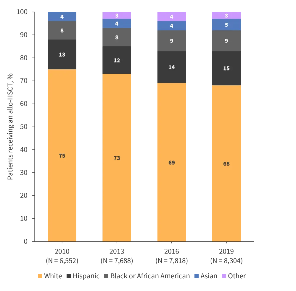 Since 2010, the number of patients receiving an allogeneic hematopoietic stem cell transplant (HSCT) has increased, but the proportion of patients from different ethnic groups has remained similar (Figure 4).