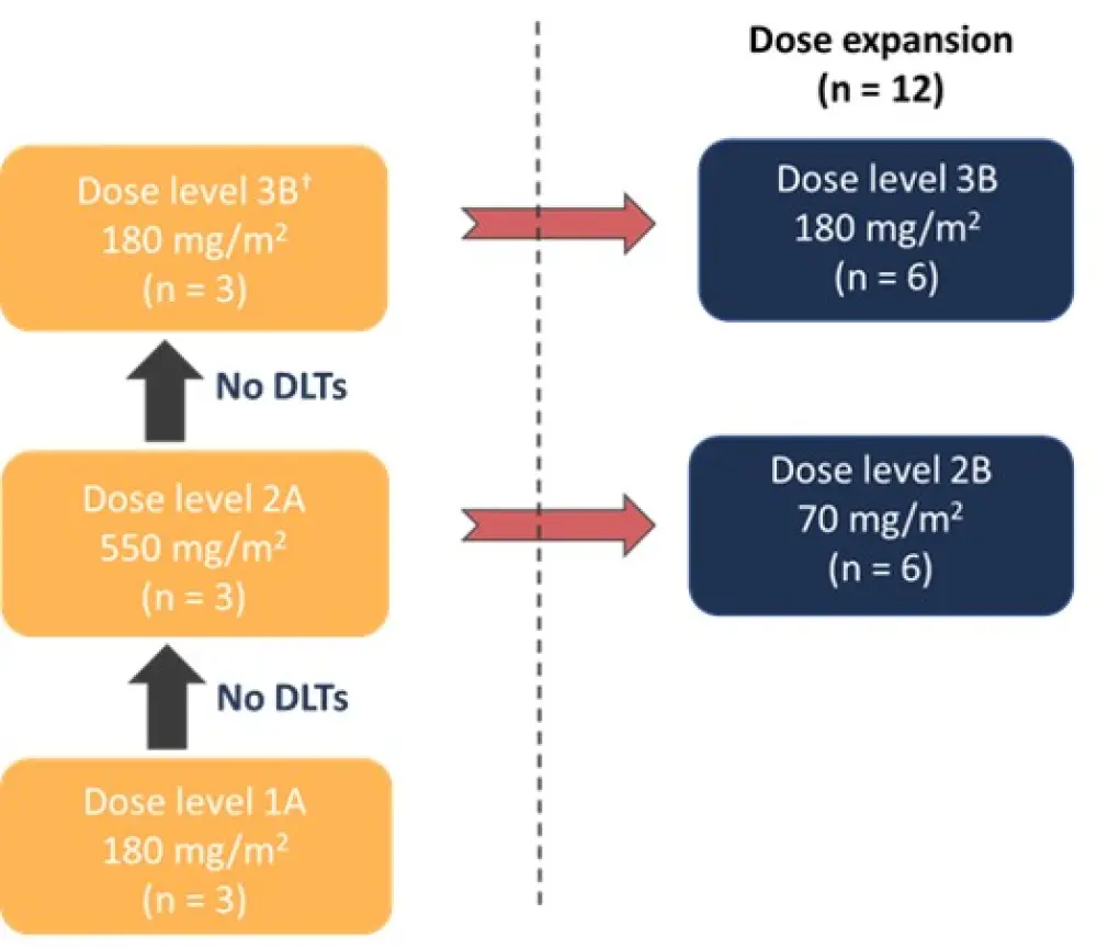 †Dose level 3A (1,100 mg/m2) was not used in the study due to drug supply shortage (was switched from A to B lot).