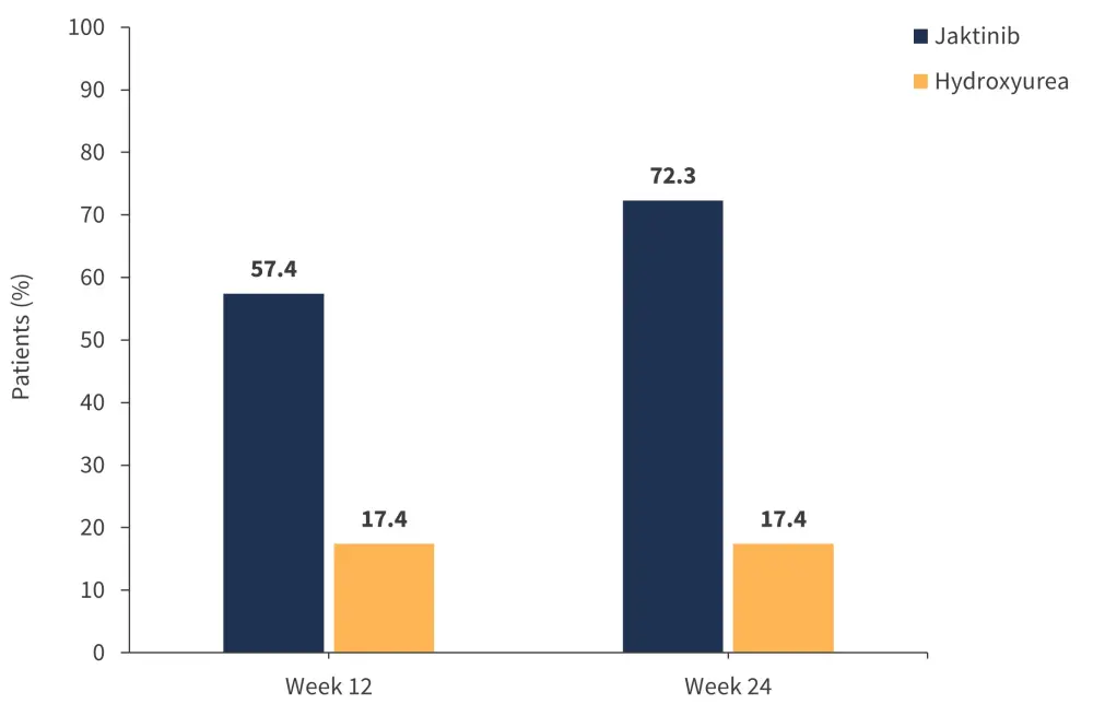 The best spleen response was 80.9% in the jaktinib arm compared with 26.1% in the HU arm. The maximum change in spleen volume from baseline was −46.59% and −18.5%, respectively.