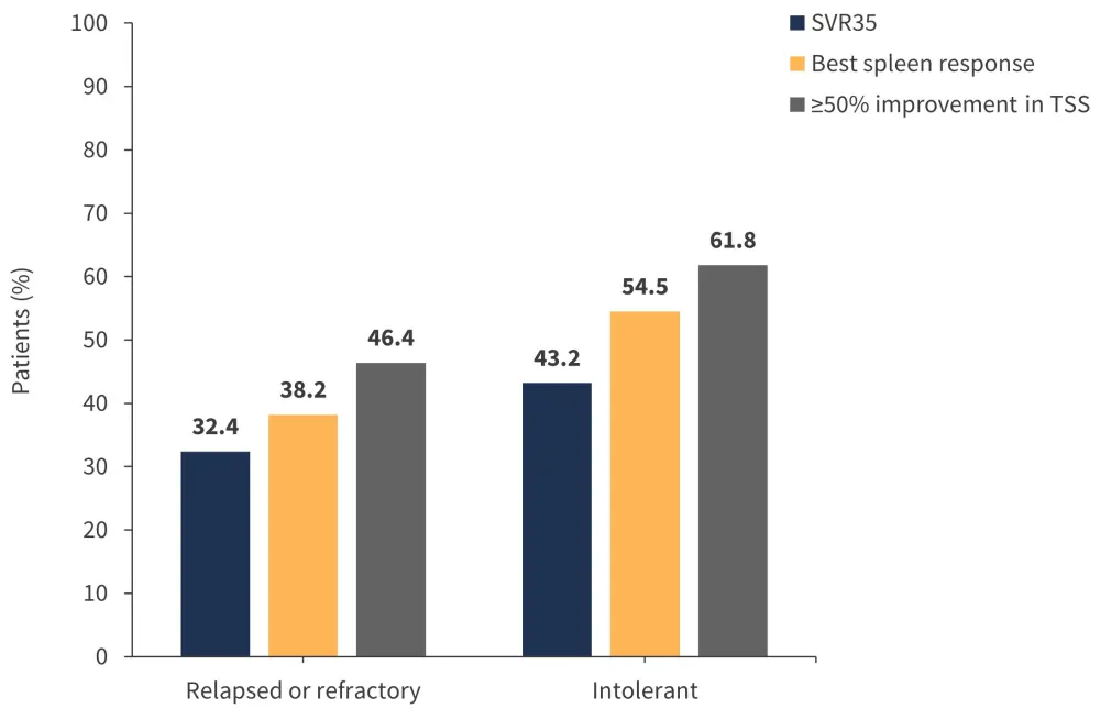 At Week 24, SVR35 was achieved in 43.2% of patients intolerant to ruxolitinib and 32.4% of patients relapsed or refractory (R/R) to ruxolitinib. Primary endpoint data, best spleen response data, and the number of patients achieving a ≥50% improvement in TSS from baseline are shown in Figure 3.