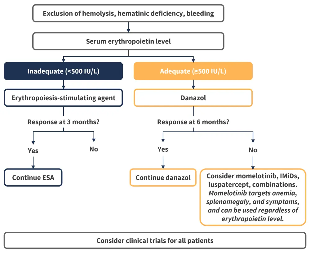 The most recent National Comprehensive Cancer Network (NCCN) guidelines for the management of MF-associated anemia recommend clinical trial enrollment as the preferred option for all patients, with momelotinib as a co-preferred option for patients with uncontrolled symptomatic splenomegaly and/or constitutional symptoms.27 For patients without symptomatic splenomegaly and/or constitutional symptoms, other recommendations include luspatercept, danazol, momelotinib, and pacritinib.27 For patients with anemia and symptomatic splenomegaly and/or constitutional symptoms, recommendations include ruxolitinib combinations as well as luspatercept, danazol, momelotinib, and pacritinib in certain circumstances.27