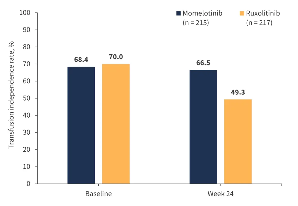 In a post hoc subgroup analysis of the phase III SIMPLIFY-2 study (momelotinib vs BAT; 88.5% continued ruxolitinib) in JAKi-experienced patients with MF (n = 156), anemia-related benefits, including mean hemoglobin levels over time and transfusion independence rates at Week 24, were higher with momelotinib vs BAT in both patients who were non-transfusion independent at baseline and those with baseline hemoglobin of <100 g/L.25 The analysis provided evidence that in patients with moderate-to-severe anemia and/or those who were transfusion dependent, switching to momelotinib improved outcomes when compared to continuing with ruxolitinib and providing supportive therapies for anemia.25