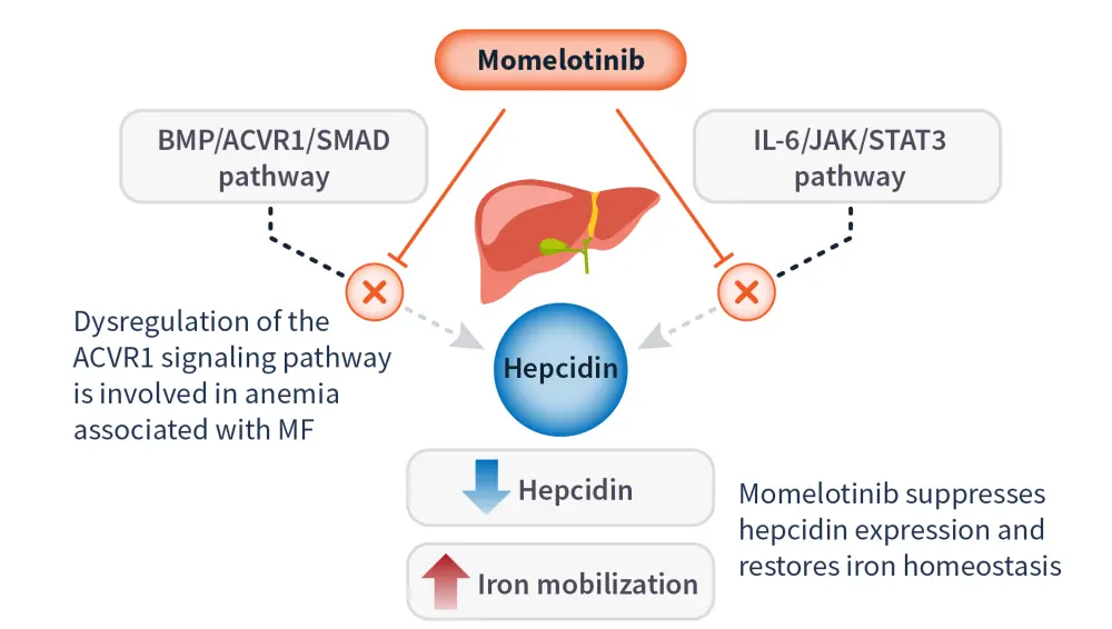 Momelotinib is an ATP-competitive small molecule inhibitor of JAK proteins (including JAK1, JAK2, JAK3), TYK2, and activin A receptor type 1 (ACVR1).17 This dual mechanism of action leads to reduced hepcidin expression and increased iron availability for erythropoiesis (Figure 3).17,18