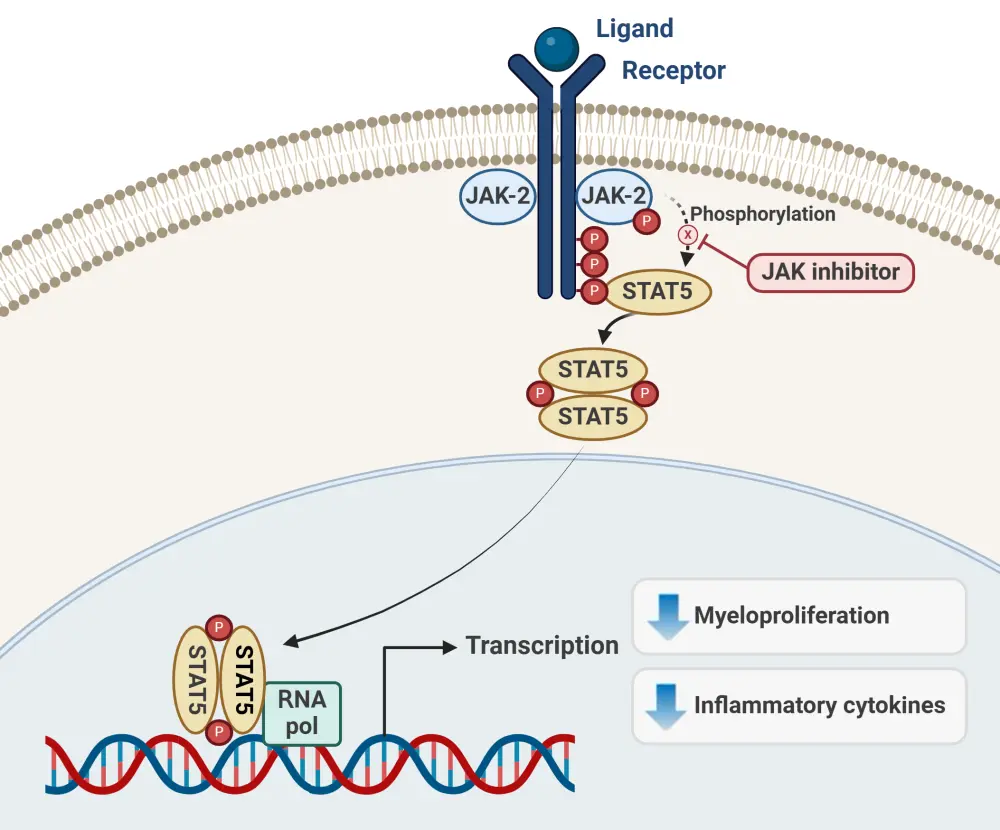 Janus kinase (JAK) mutations are the most common mutations in MF, and JAK/STAT-mediated signaling pathway dysregulation leading to abnormal myeloproliferation and overproduction of inflammatory cytokines plays a key role in MF pathogenesis (Figure 1).1,3 JAK is therefore an important target for MF treatment, and several JAK inhibitors (JAKis) are now approved for the management of MF, including ruxolitinib, fedratinib, pacritinib, and momelotinib.3,4