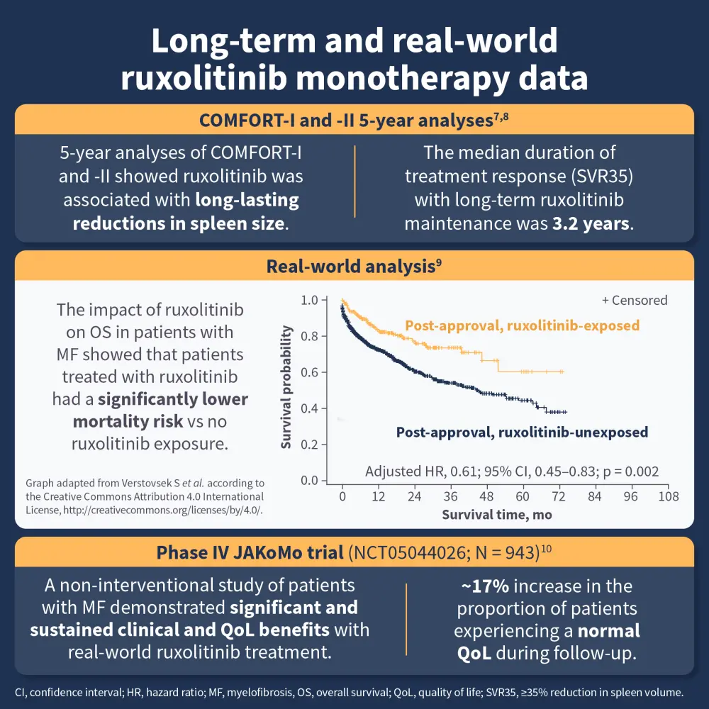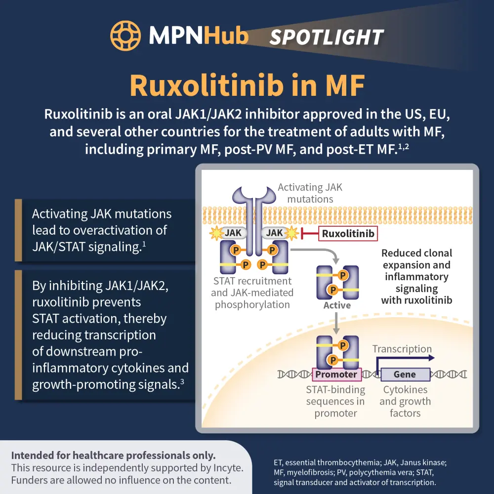 Ruxolitinib, an oral Janus kinase 1/2 (JAK1/JAK2) inhibitor, was first approved by the U.S. Food and Drug Administration (FDA) in 2011 for the treatment of patients with intermediate- or high-risk myelofibrosis (MF), including primary MF, post-polycythemia vera (PV) MF, and post-essential thrombocythemia MF, and remains a mainstay of treatment for these patients.1,2 Ruxolitinib targets primary drivers of MF including constitutive Janus kinase (JAK) and signal transducer and activator of transcription (STAT) pathway activation, thereby regulating inflammatory cytokine signaling and hematopoiesis.1,3