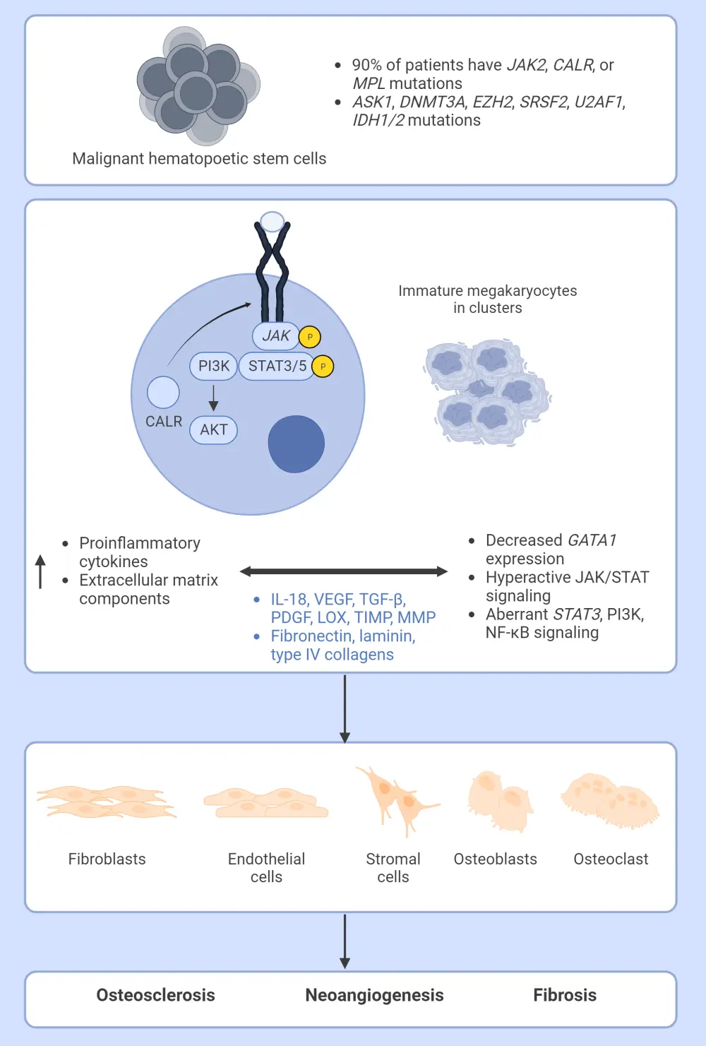 ASK1, Apoptosis signal-regulating kinase 1; CALR, calreticulin; DNMT3A, DNA methyltransferase 3 alpha; EZH2, enhancer of zeste homolog 2; GATA1, GATA-binding factor 1; IDH1/2, isocitrate dehydrogenases types 1 and 2; IL-18, interleukin 18; JAK, Janus kinase; LOX, lysyl oxidase; MMP, matrix metalloproteinase; PDGF, platelet derived growth factor; PI3K, phosphoinositide 3-kinase; NF-κB, nuclear factor kappa light chain enhancer of activated B cells; SRSF2, serine and arginine rich splicing factor 2; STAT, signal transducers and activators of transcription; TGF-β, transforming growth factor beta; TIMP, tissue inhibitor of metalloproteinases; U2AF1, U2 small nuclear RNA auxiliary factor 1;VEGF, vascular endothelial growth factor.