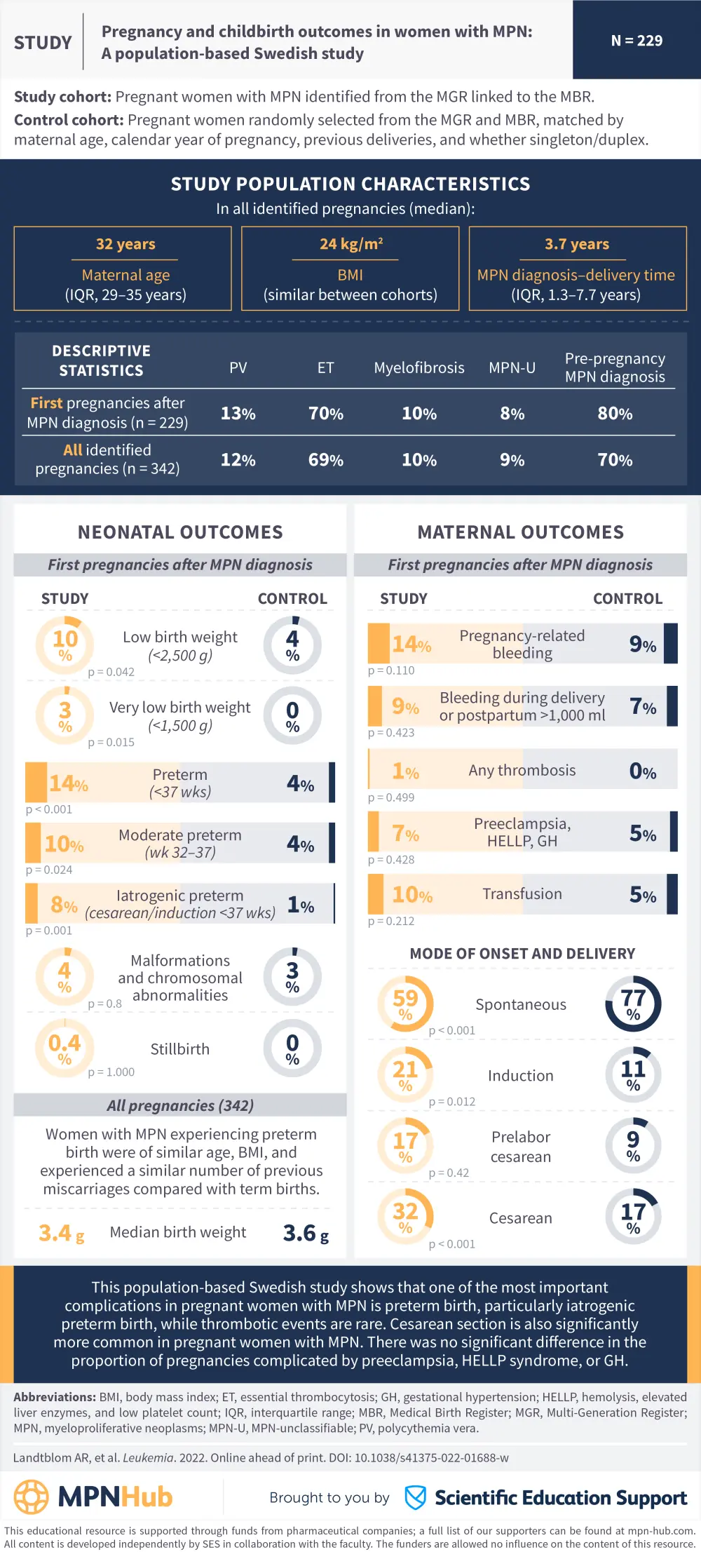 Here, we present a visual abstract representing the key findings from a large population-based study of pregnant women with MPN in Sweden and the associated neonatal and maternal adverse events, which were published by Landtblom, et al.1 in Leukemia.