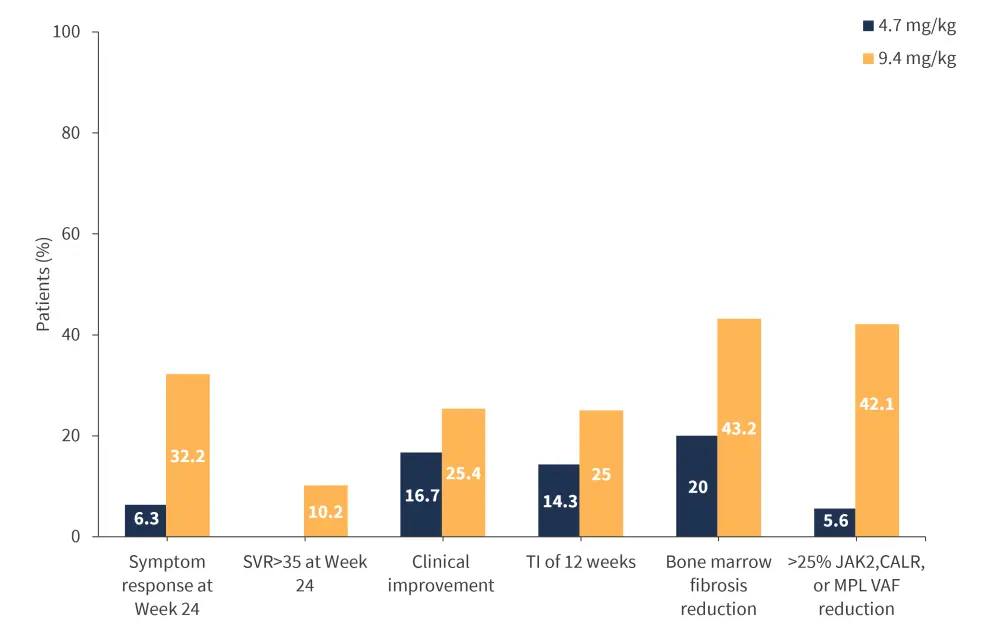 Imetelstat is a telomerase inhibitor currently under investigation in the phase II IMbark trial (NCT02426086) in intermediate-2 or high-risk patients with MF who are R/R to JAKis. Patients were randomized to receive either 9.4 mg/kg or 4.7 mg/kg of imetelstat every 3 weeks. A greater clinical benefit was observed at the higher dose of imetelstat (Figure 1). Moreover, improved BMF and a ≥20% VAF reduction was associated with a longer median OS and higher survival rate.
