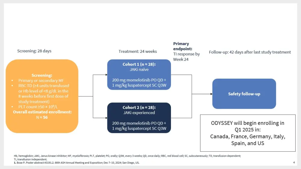 The phase II ODYSSEY trial (NCT06517875) will assess the combination of momelotinib and luspatercept in TD patients with MF (Figure 4).13