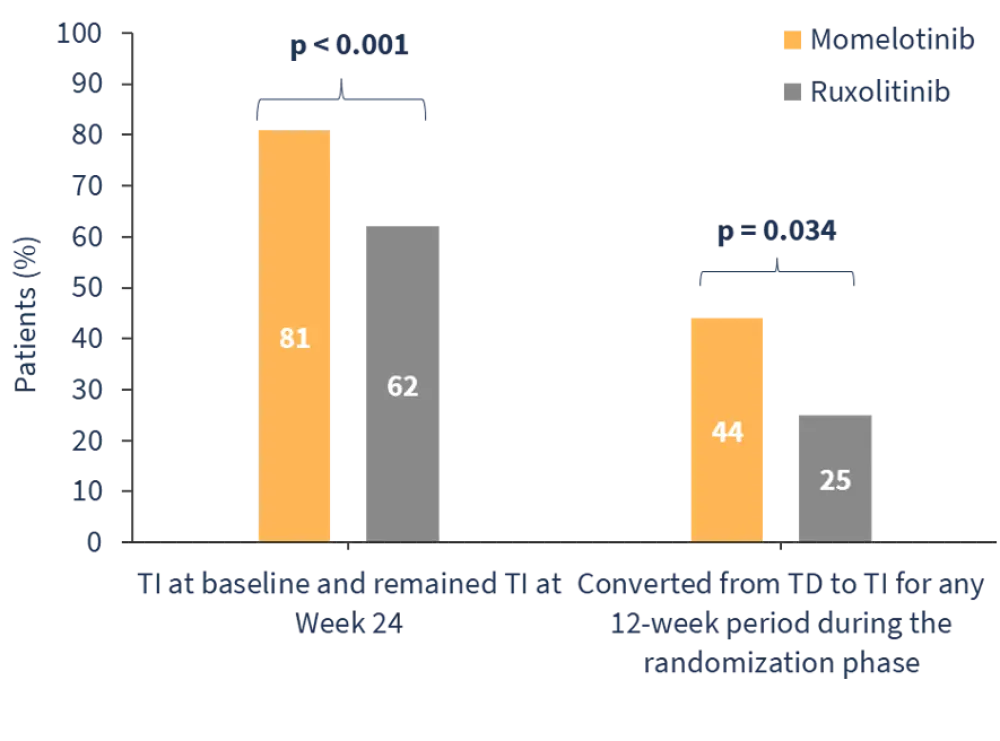 In the SIMPLIFY-2 trial, although SVR35 response rates were similar, momelotinib improved TI rates vs best available therapy (43% vs 21%; p = 0.012).5