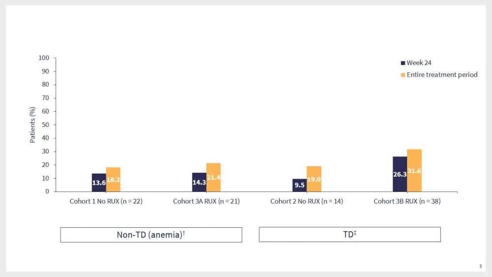 Anemia was observed more frequently in the ruxolitinib arm (38.0%) vs the momelotinib arm (13.6%).4