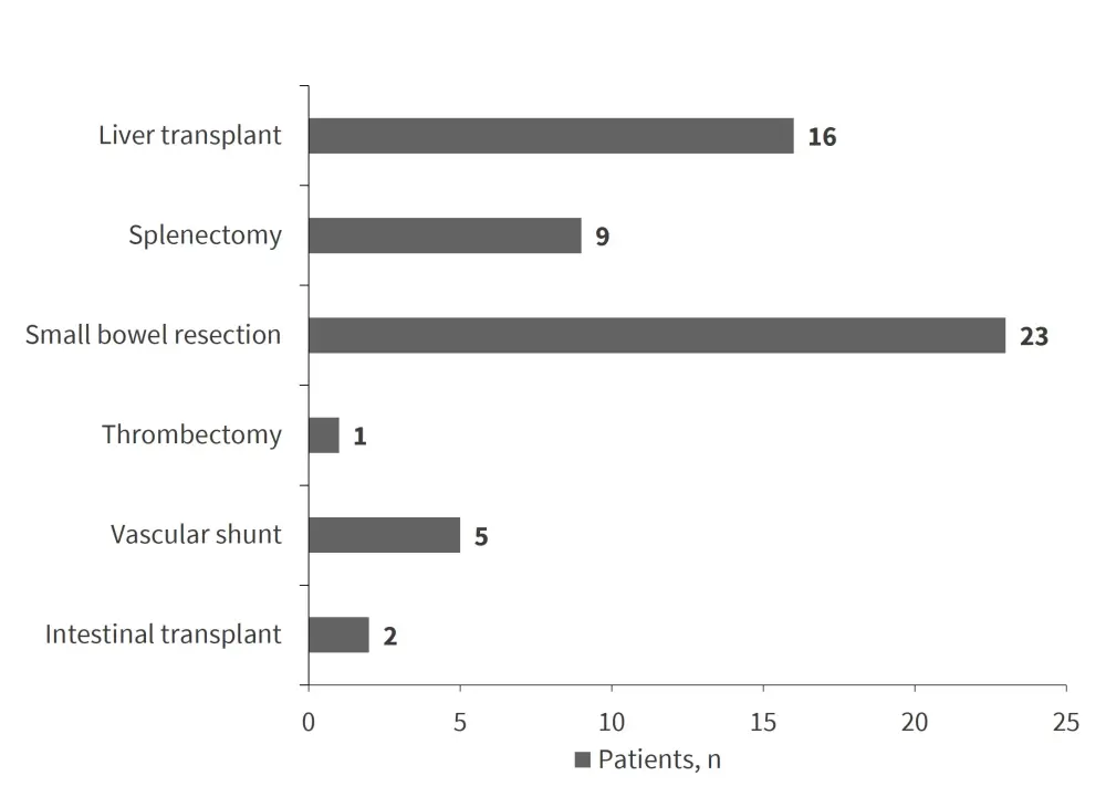 Surgical interventions were needed in 52 patients (25.6%) and are detailed in Figure 3.