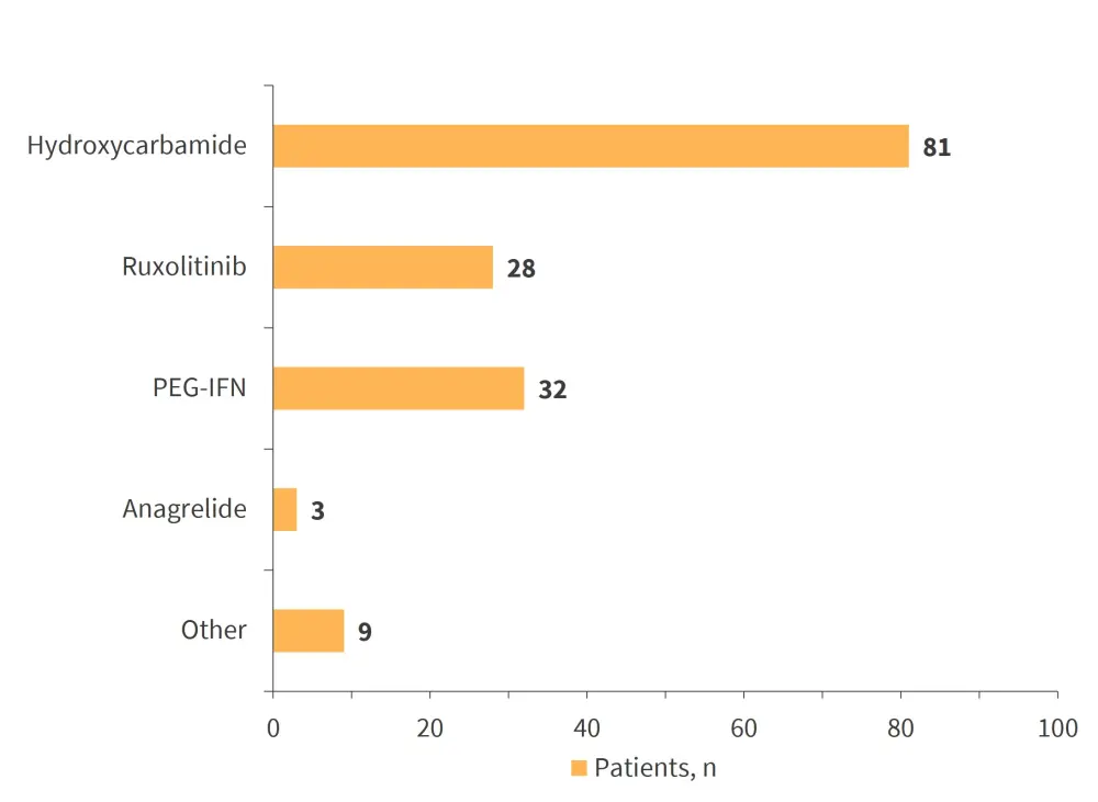 153 patients (68.9%) received cytoreduction treatment on registration. The cytoreductive agent was switched in 55 patients (35.9%) due to intolerance (50.9%) and lack of response (32.7%). 10 patients (21.7%) switched from hydroxycarbamide to ruxolitinib, and six patients (13.0%) switched from hydroxycarbamide to pegylated interferon. The cytoreductive agents used at registration are displayed in Figure 2.