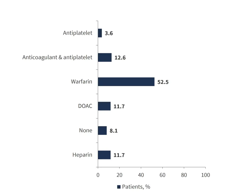 The initial anticoagulation strategy was heparin in line with the local policy. Over half of all patients were treated with warfarin (52.5%). The choice of anticoagulants at registration is detailed in Figure 1. Patients with hepatic vein thrombosis were more likely to be on anticoagulants and antiplatelets (25.8%) than those without hepatic vein thrombosis (9.4%), which was statistically significant (p = 0.004). 13 patients switched from warfarin to direct oral anticoagulant (DOAC) due to convenience, and three patients switched from DOAC to warfarin due to thrombosis.
