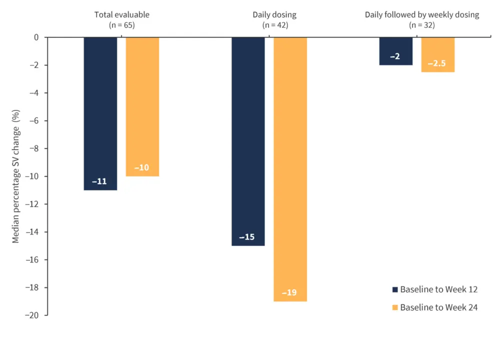 Figure 2. Median percentage change of spleen volume from baseline, Week 12, and Week 24 in patients treated daily and weekly with parsaclisib after ruxolitinib treatment*