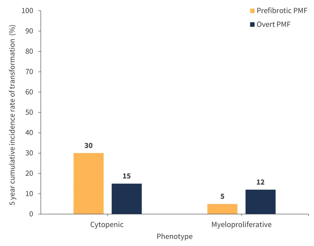 In the study’s most recent follow-up, 20 patients with profibrotic PMF experienced a transformation to acute leukemia. The 5‑year cumulative incidence rate of leukemic transformation in patients with prefibrotic PMF was significantly higher in those with CP compared with those with a proliferative phenotype (p < 0.0001; Figure 5).