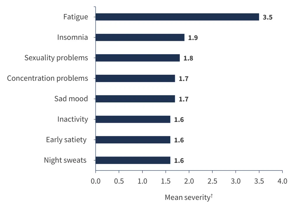 One or more moderate or severe symptoms were reported by 70% of patients, with the most common including2: