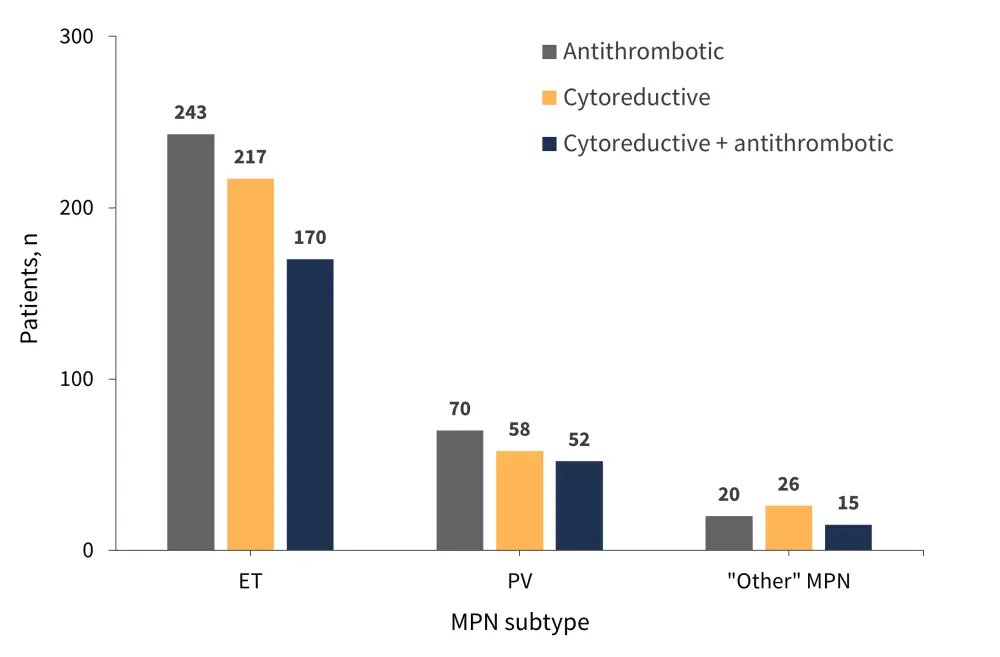 During follow-up, 301 patients received ≥1 cytoreductive treatment, 333 patients received antiplatelet and anticoagulant therapy, and 47 did not receive any treatment. Allogeneic hematopoietic stem cell transplantation (allo-HSCT) was performed in seven patients. The distribution of therapies across disease subgroups is shown in Figure 2.
