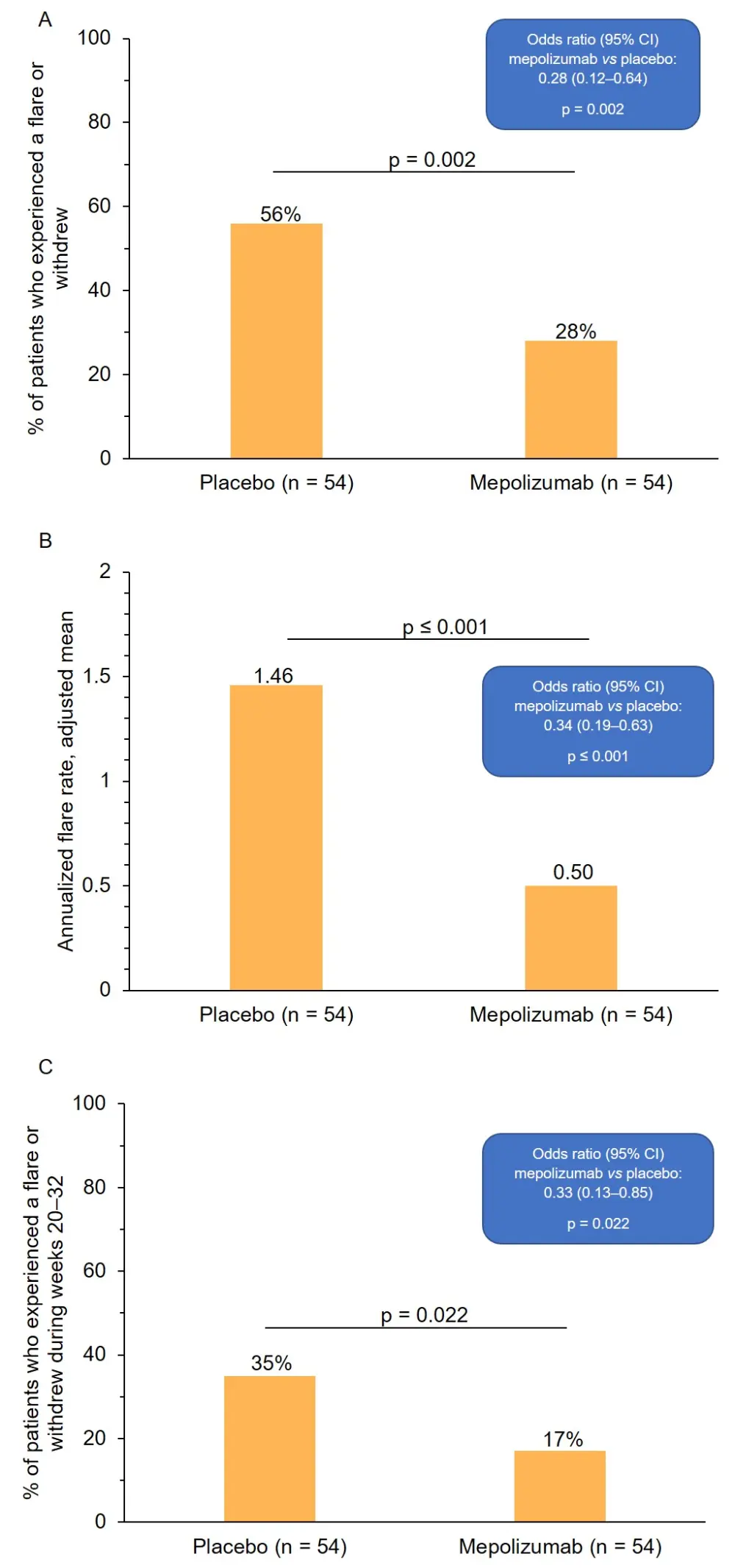 • A 53% reduction in the proportion of patients who experienced a flare or withdrew from the study in the final 12 weeks of the study period was observed in the mepolizumab vs placebo groups (Figure 1C)