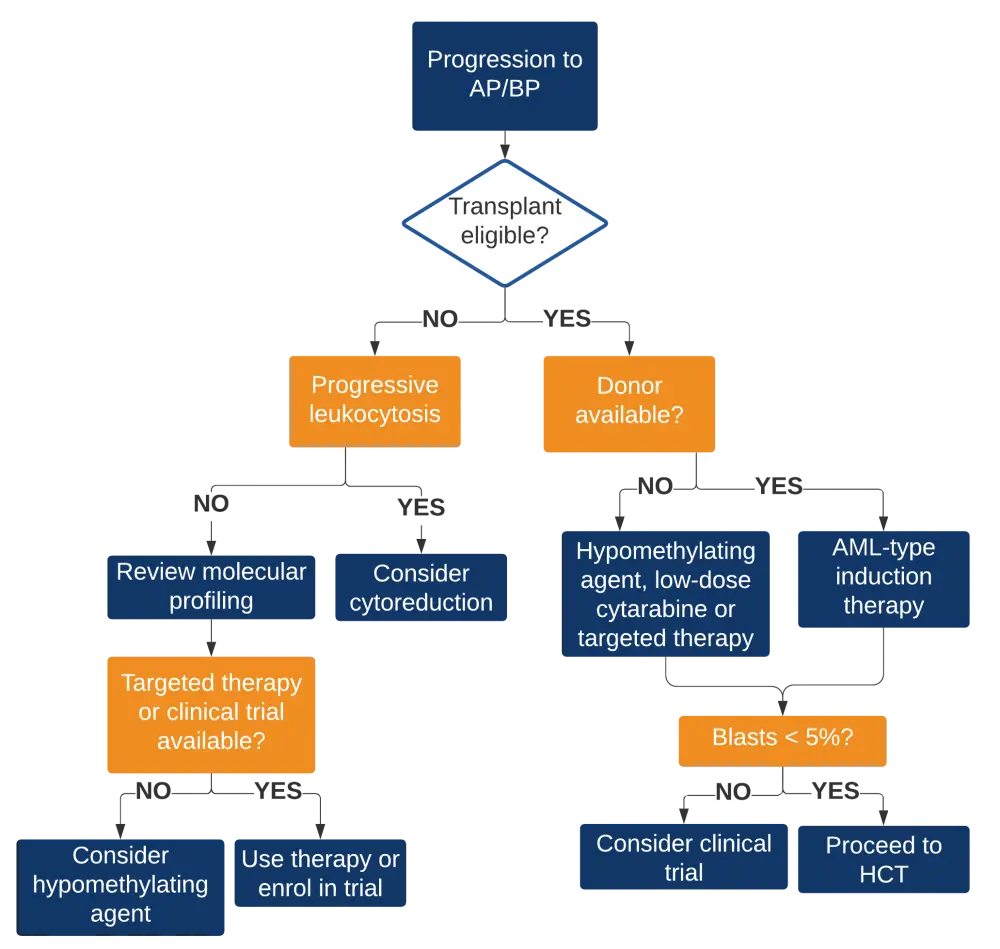AP, accelerated phase; AML, acute myeloid leukemia; BP, blast phase; HCT, hematopoietic cell transplantation