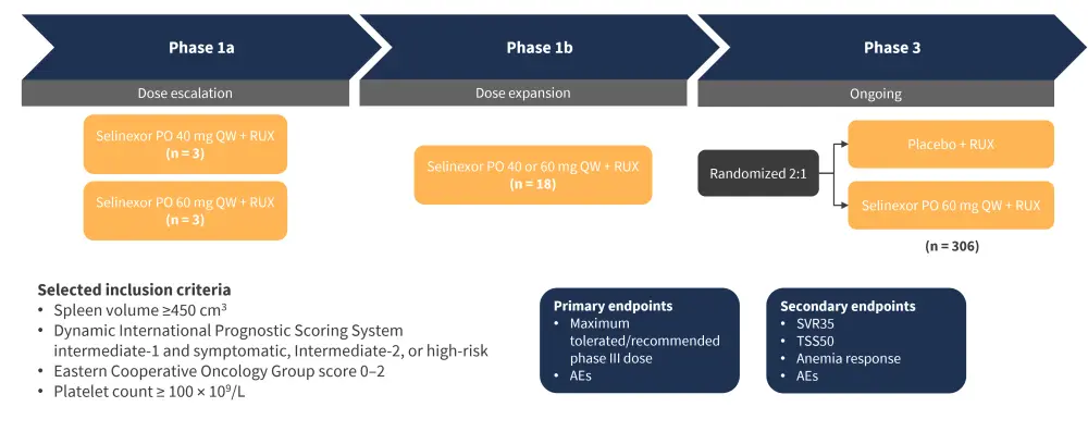 AE, adverse event; PO, oral; QW, once weekly; RUX, ruxolitinib; SVR35, spleen volume reduction ≥35%; TSS50, Total Symptom Score reduction ≥50%.