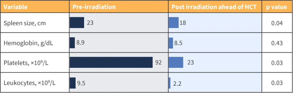 • Splenic irradiation reduced spleen size immediately after irradiation and OS and NRM were comparable to non-irradiated patients.