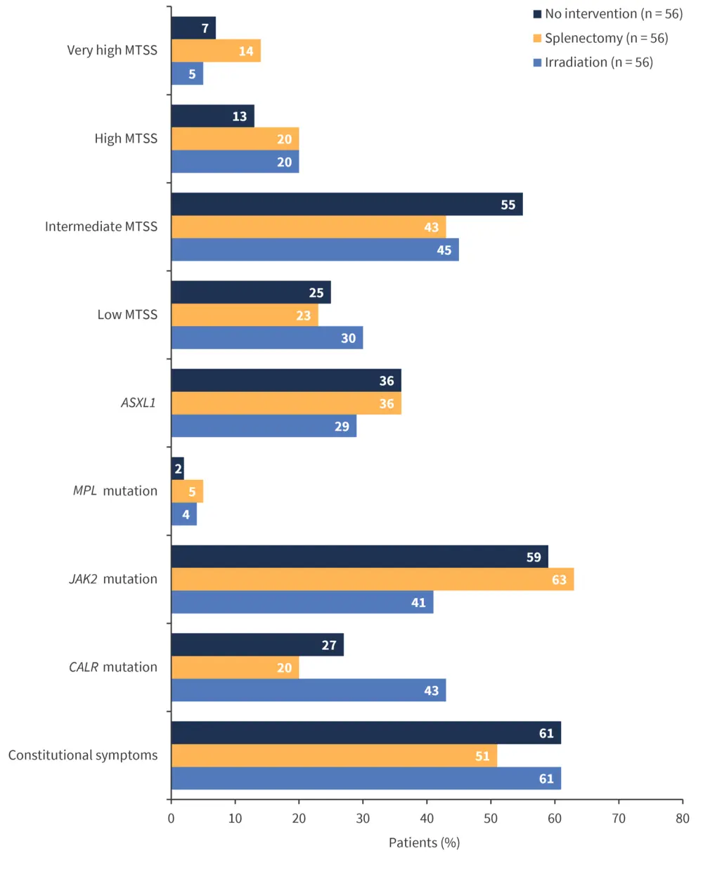 • Approximately 40% of patients had a calreticulin mutation and >40% had a JAK2 mutation.