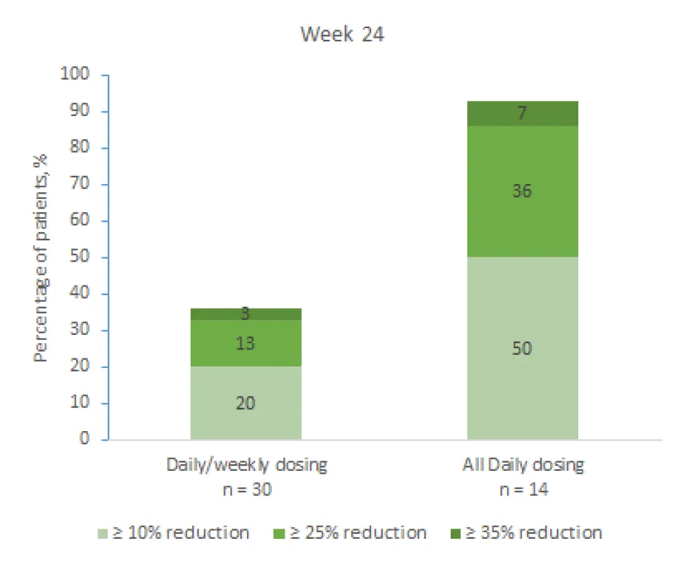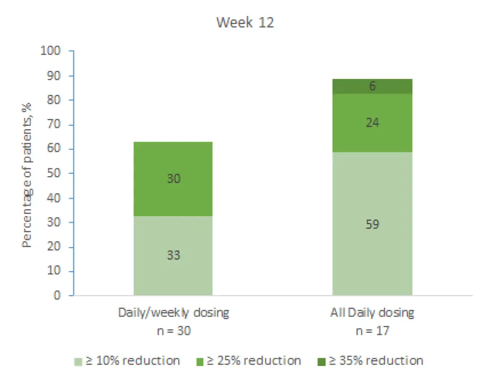 The responses were classified into three categories, reduction by ≥ 10%, ≥ 25%, and ≥ 35%, and measured at Weeks 12 and 24. Results from both time points are shown in Figure 1 and 2, respectively. Median percentage change at Week 12 and Week 24 with QD/QW dosing and QD dosing were −2.3 and −15.4, and −2.5 and −25.4, respectively. These results indicate that the treatment effect was more profound at Week 24 and in favor of QD dosing at both timepoints.