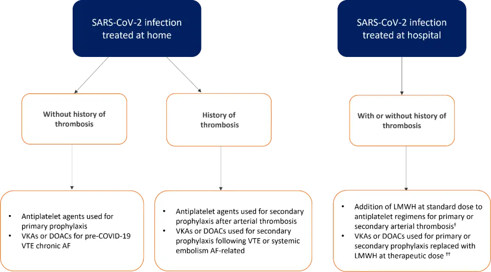 This advice is aligned with that for the general population, as only the ELN study reported thrombotic events in patients with MPN. A risk stratified approach was thought to be most beneficial. Those with more severe infection requiring hospitalization will have LMWH at standard dose added to standard antiplatelet agent regimens for primary prophylaxis. For secondary prophylaxis or atrial fibrillation, anti-vitamin k antagonists or direct oral anticoagulants should be replaced completely with LMWH at therapeutic doses (Figure 1).