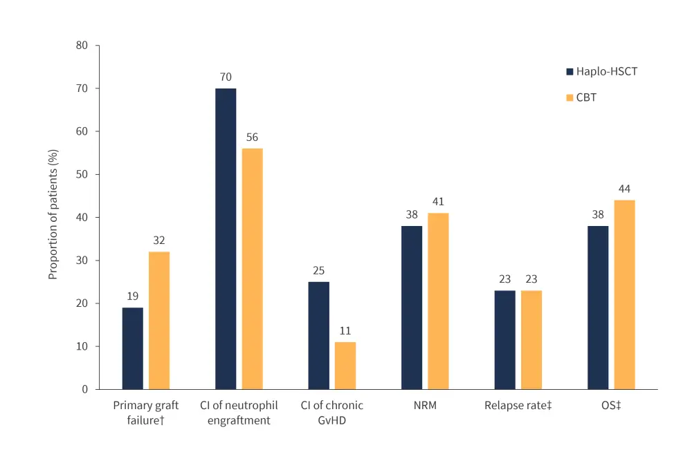 Figure 1. Neutrophil engraftment and survival responses in patients with MF who received haplo-HSCT compared with CBT*