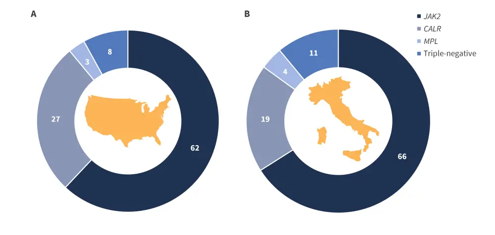 Janus kinase 2 gene mutations are the most common driver mutation in myeloproliferative neoplasms, accounting for 62% and 66% of patients with ET in the US and Italian centers. Across both centers the distribution of driver mutations was comparable (Figure 2) with the order of most common mutations in both being: